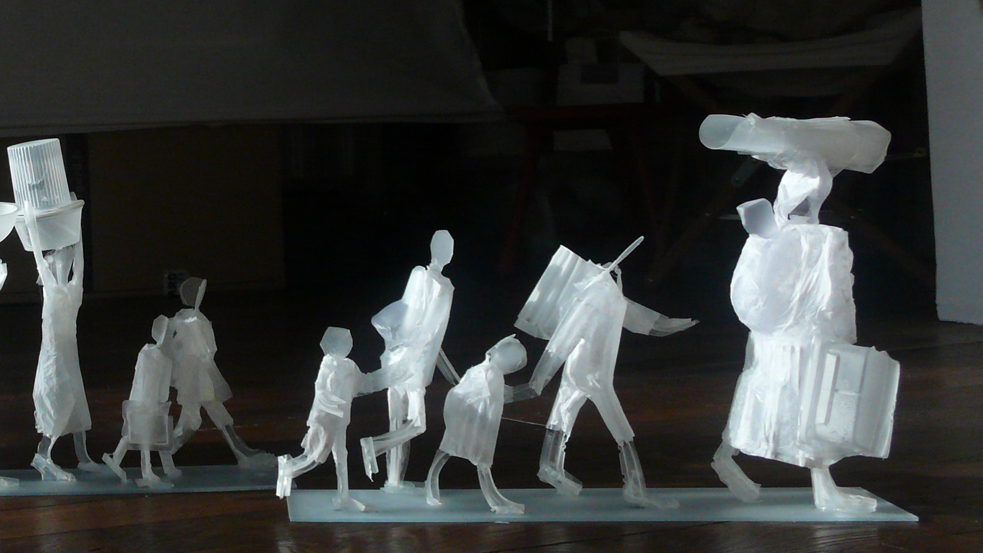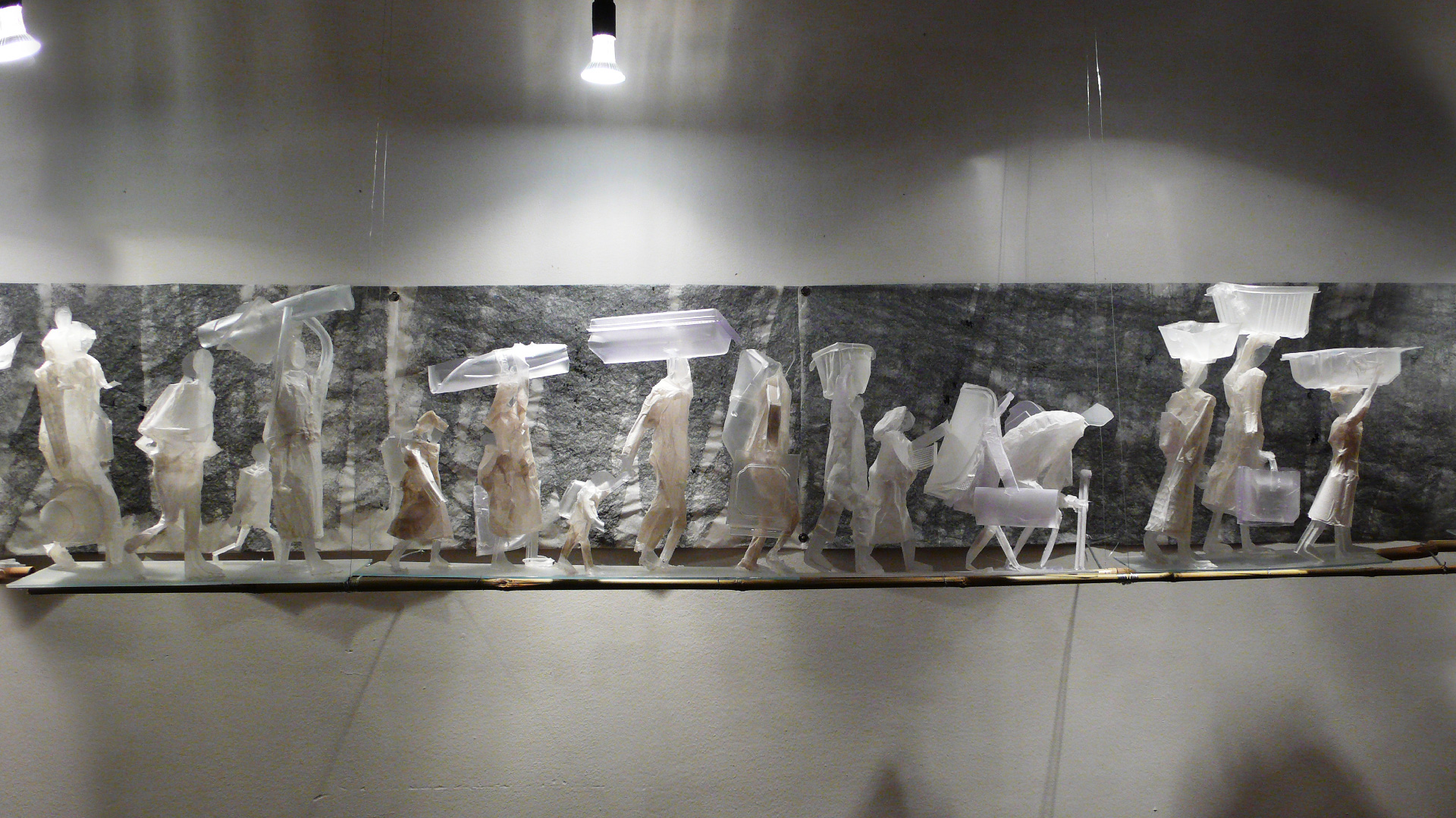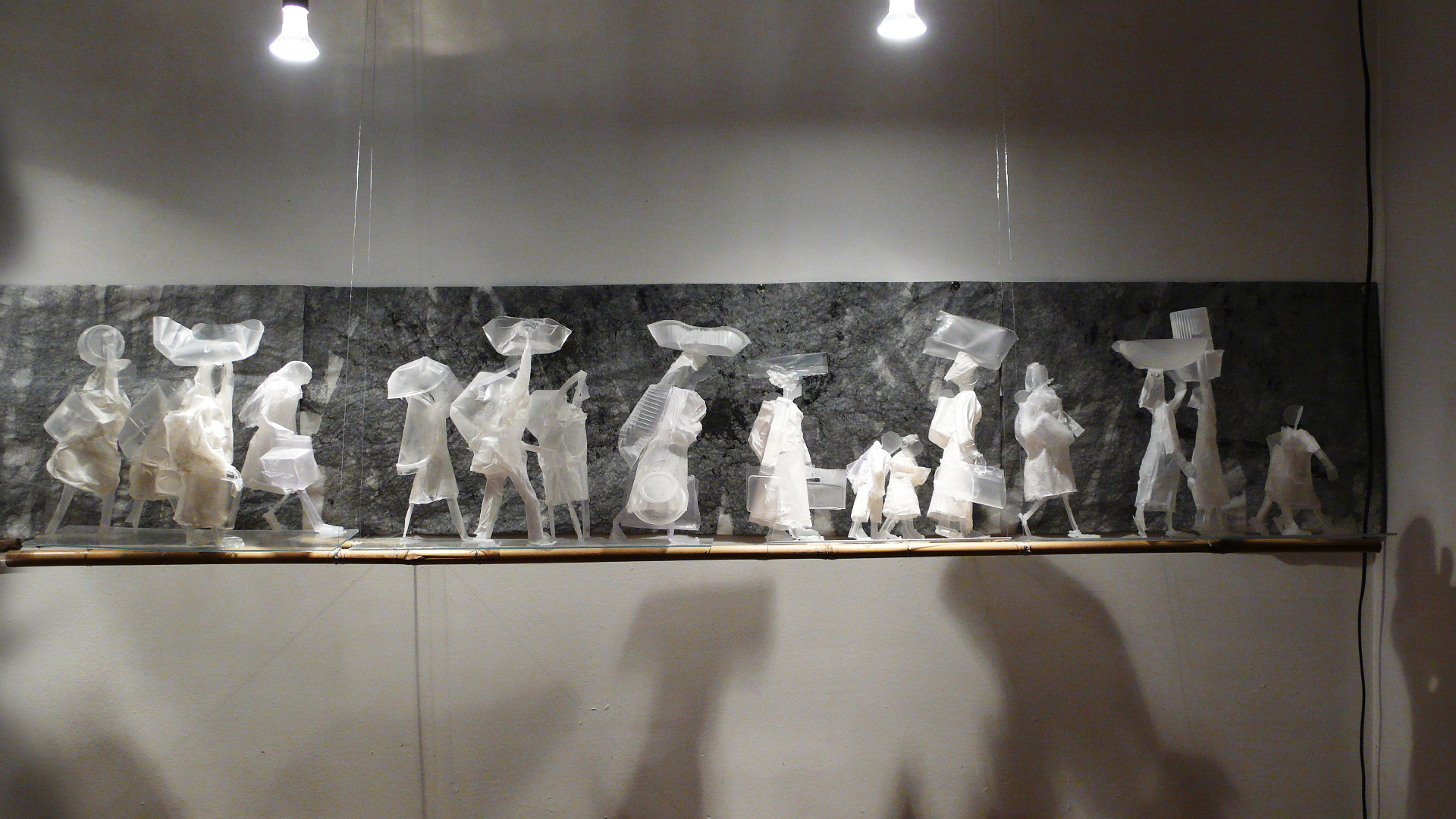 Les fugitifs déploient un paysage fragile de silhouettes suspendues sur de minces tiges de bambou, au-dessus du vide. Simplifiées, esquissées, réduites à leurs seules attitudes, des femmes portent des emballages plastiques vides, des enfants, un vieillard hésite. Dans une tension extrême, ces figures avancent sur un chemin incertain, comme prises dans un flux sans origine ni fin, sur une passerelle précaire au-dessus du néant.