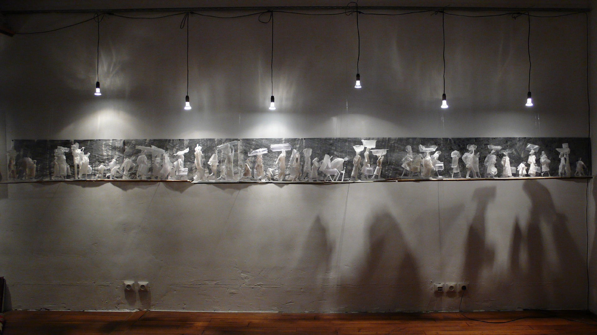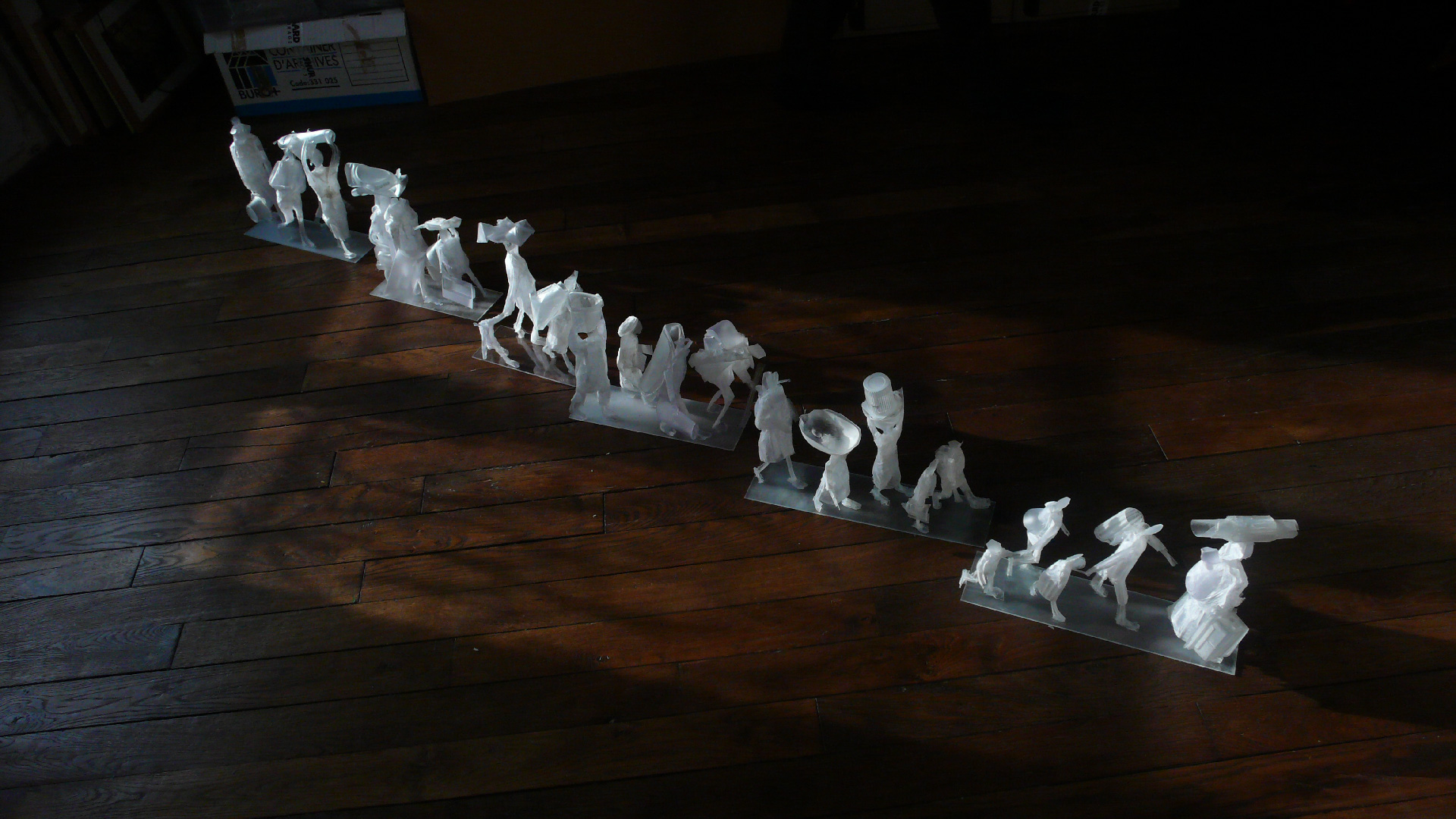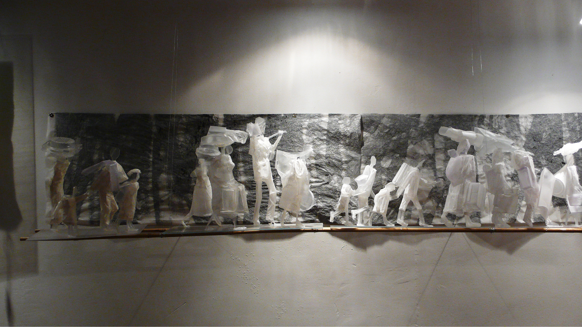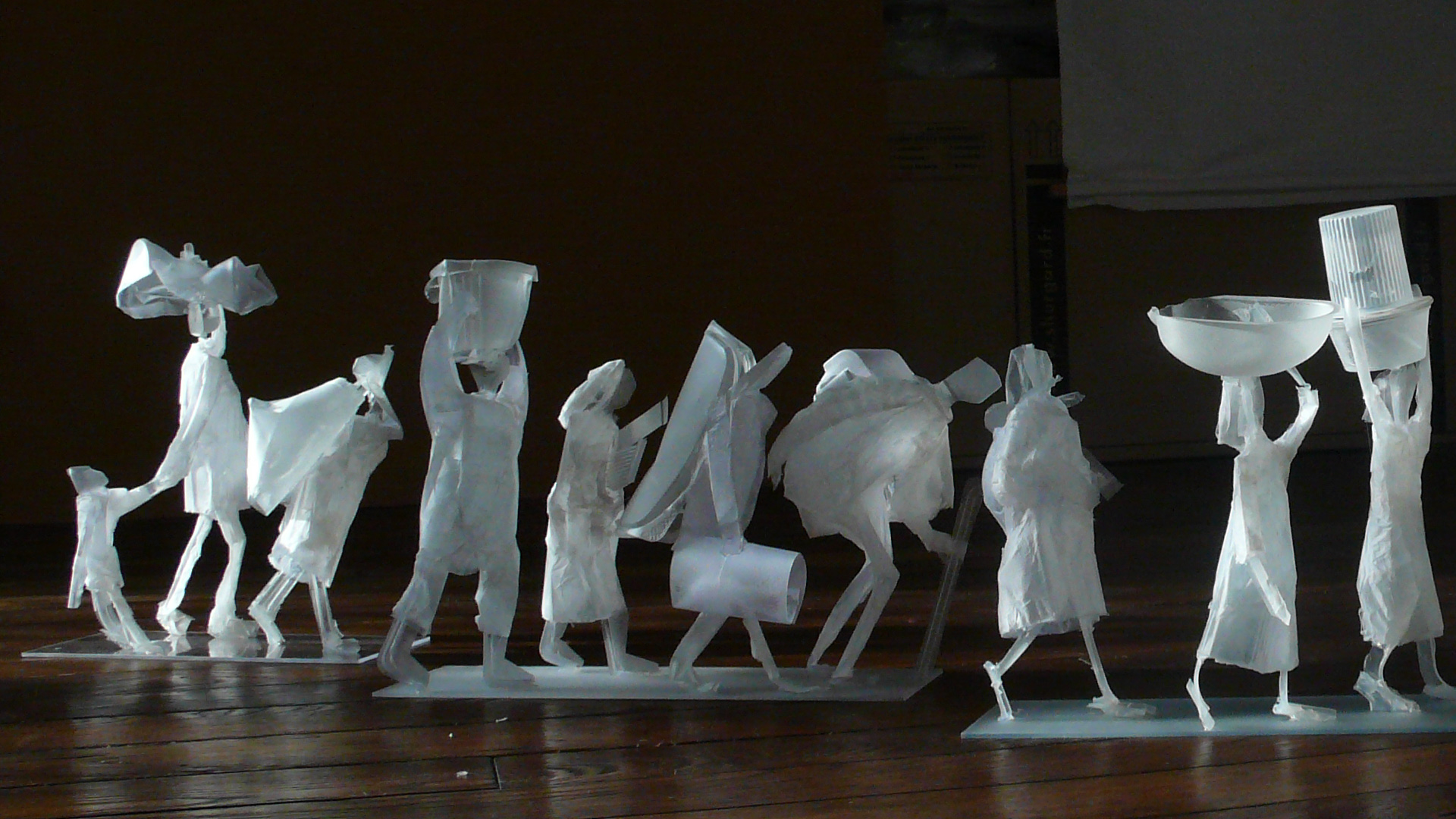 Les fugitifs déploient un paysage fragile de silhouettes suspendues sur de minces tiges de bambou, au-dessus du vide. Simplifiées, esquissées, réduites à leurs seules attitudes, des femmes portent des emballages plastiques vides, des enfants, un vieillard hésite. Dans une tension extrême, ces figures avancent sur un chemin incertain, comme prises dans un flux sans origine ni fin, sur une passerelle précaire au-dessus du néant.