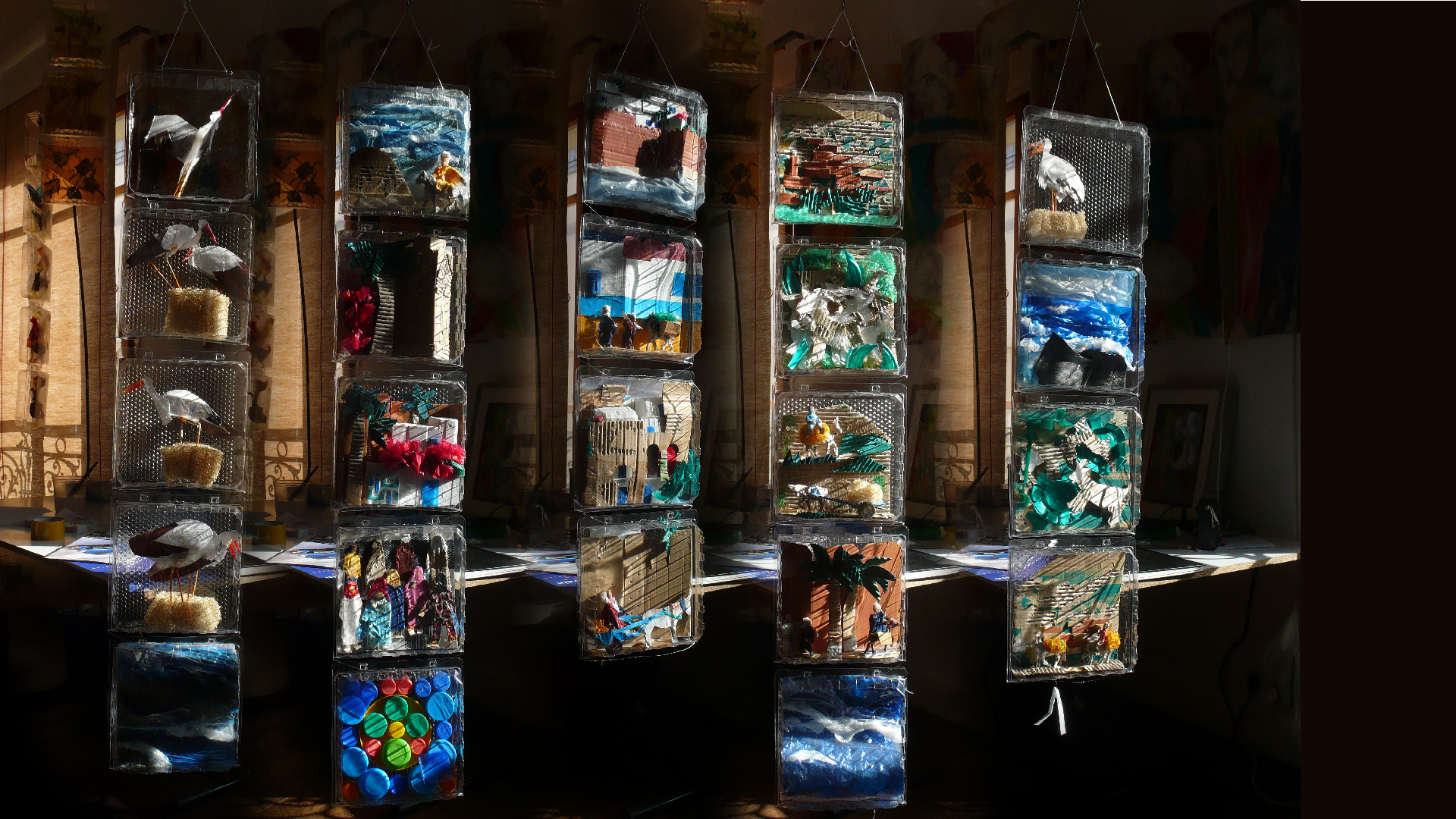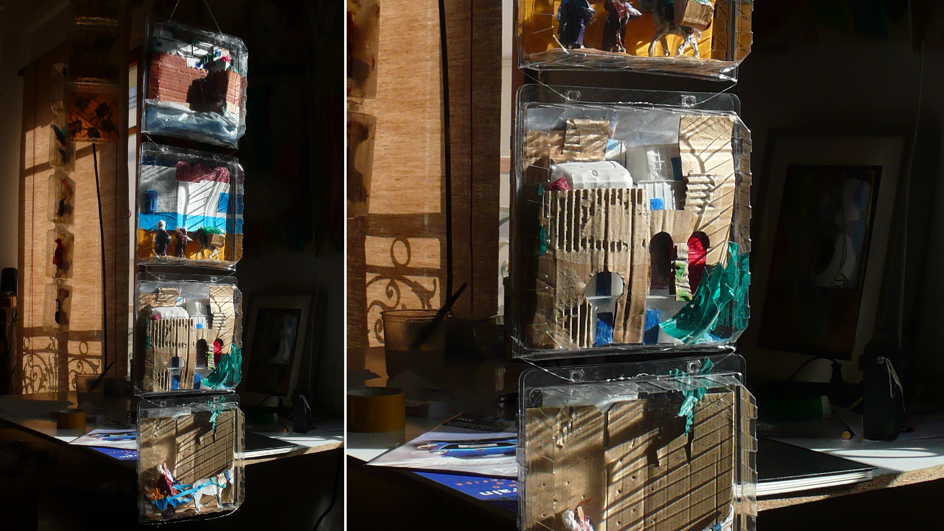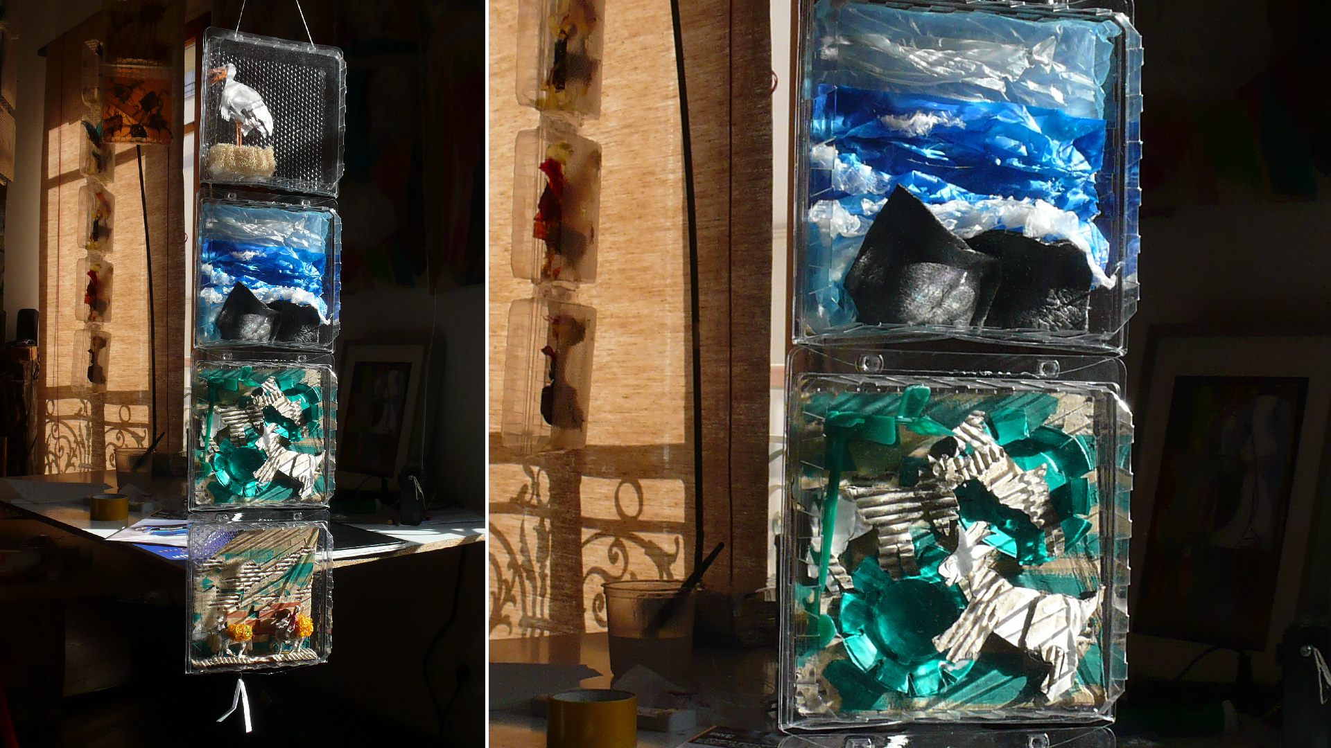Petit voyage au pays de mon enfance se compose de bandes verticales de blisters suspendus, comme une suite d’images découpées, rangées, archivées. À l’intérieur de chaque cellule, des collages de papier de soie coloré et de matériaux hétérogènes composent de petits tableaux : fragments d’architectures, de végétation, d’objets, de silhouettes — autant de scènes miniatures. L’ensemble forme un paysage suspendu, fait de transparences et de répétitions.
