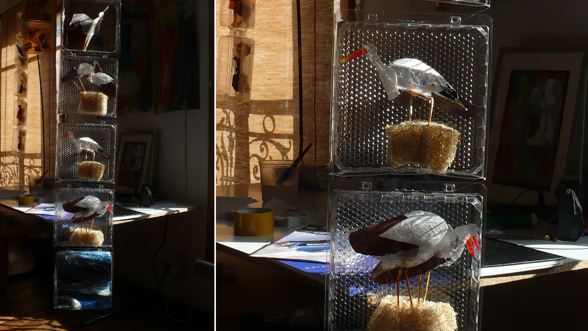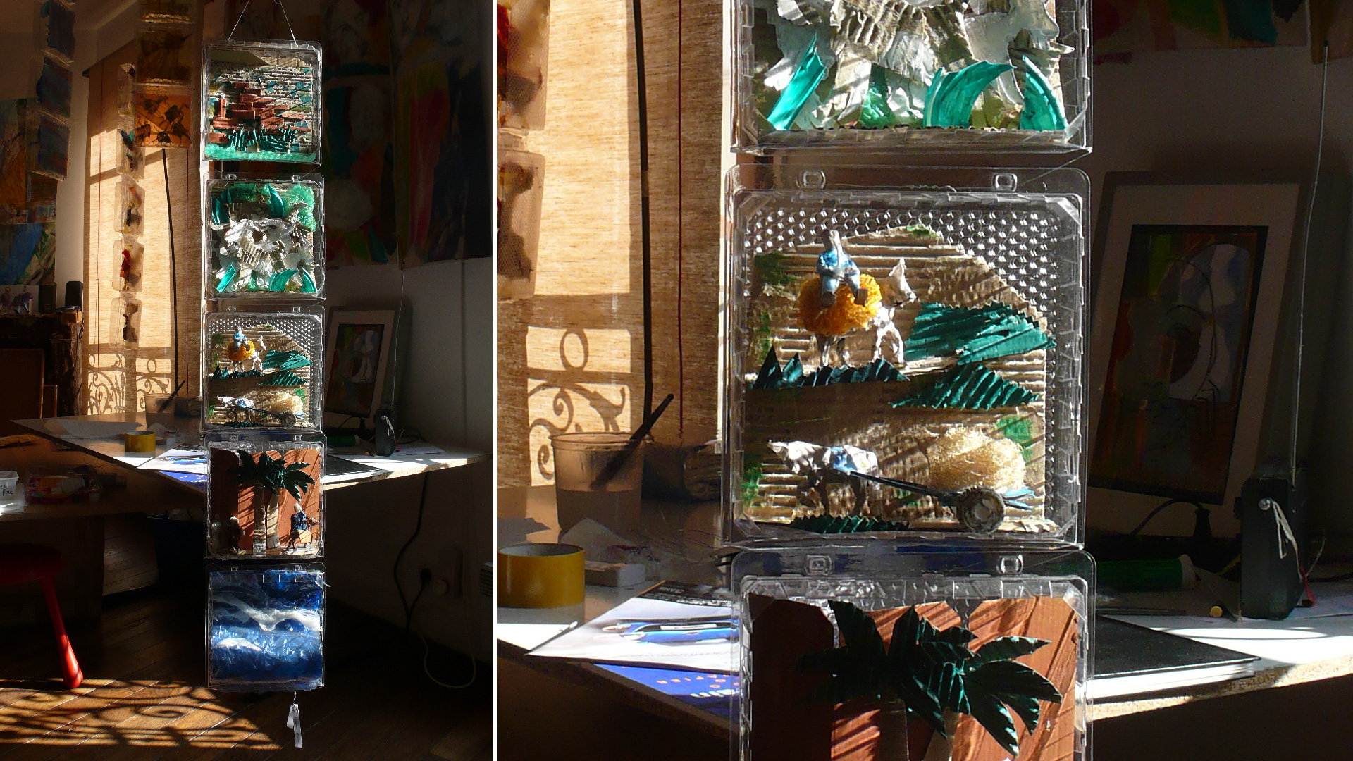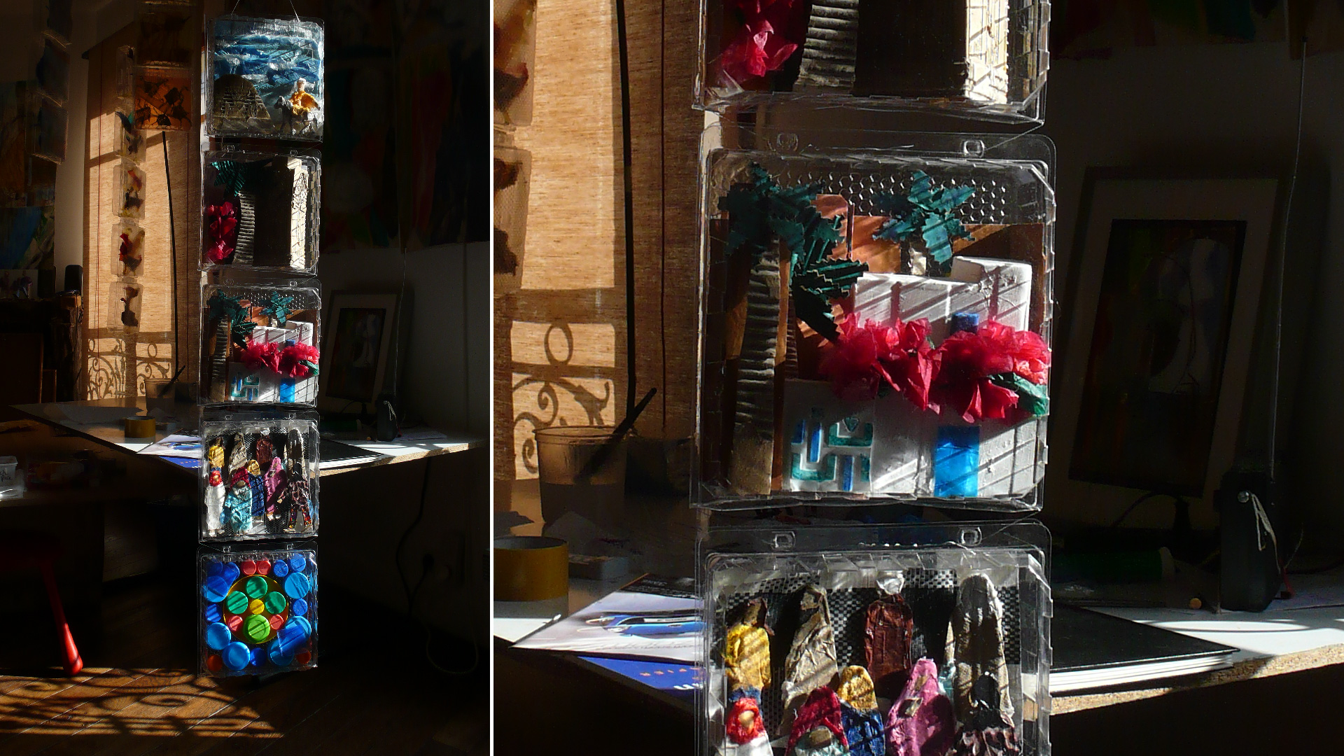 Petit voyage au pays de mon enfance se compose de bandes verticales de blisters suspendus, comme une suite d’images découpées, rangées, archivées. À l’intérieur de chaque cellule, des collages de papier de soie coloré et de matériaux hétérogènes composent de petits tableaux : fragments d’architectures, de végétation, d’objets, de silhouettes — autant de scènes miniatures. L’ensemble forme un paysage suspendu, fait de transparences et de répétitions.