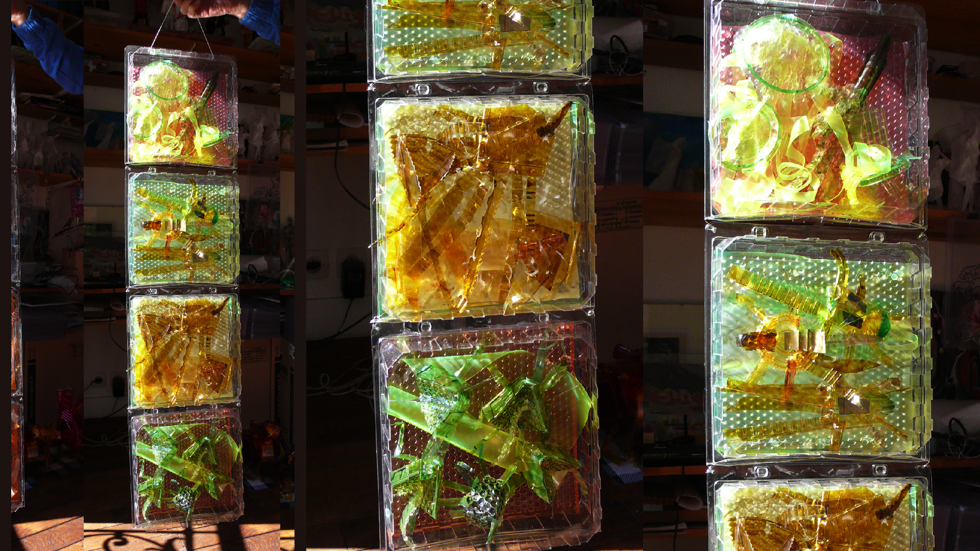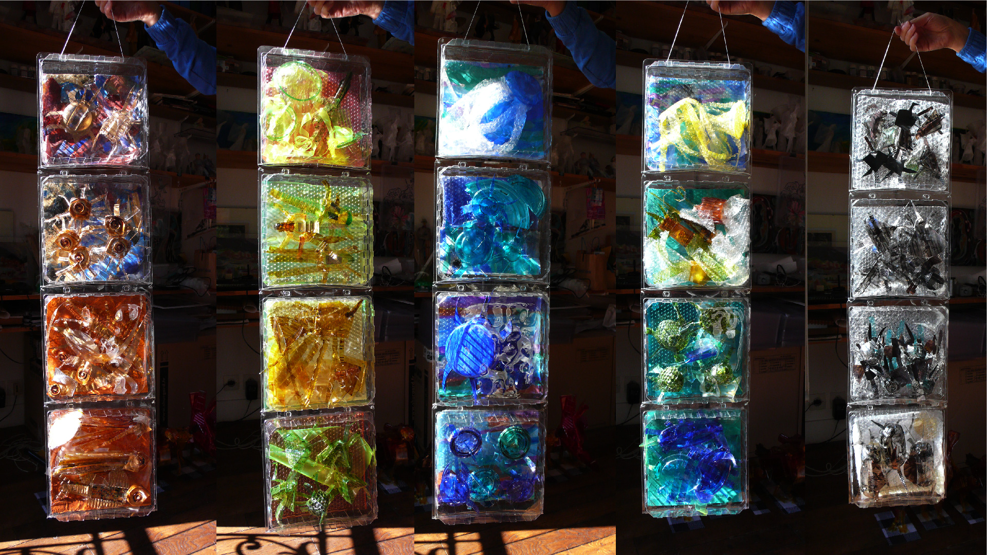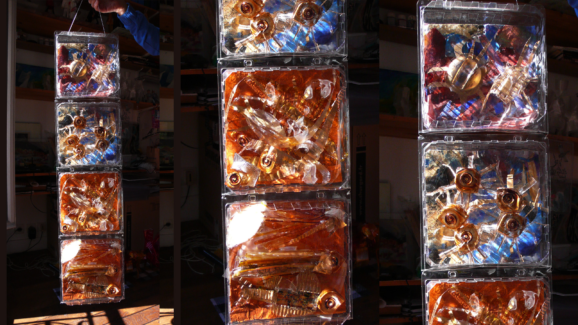 Suspendues comme des reliquaires fragiles, Les boîtes de Charles rassemblent des blisters plastiques transformés en boîtes d’entomologie. À l’intérieur : fragments, éclats, déchets, chutes de plastique recouverts de peinture pour verre. La lumière traverse ces micro-architectures et révèle textures, couleurs et reliefs.