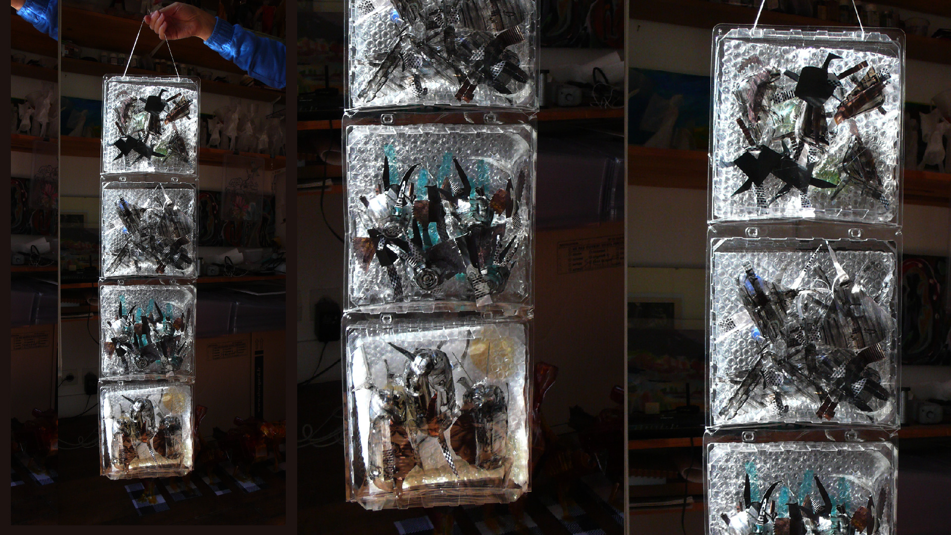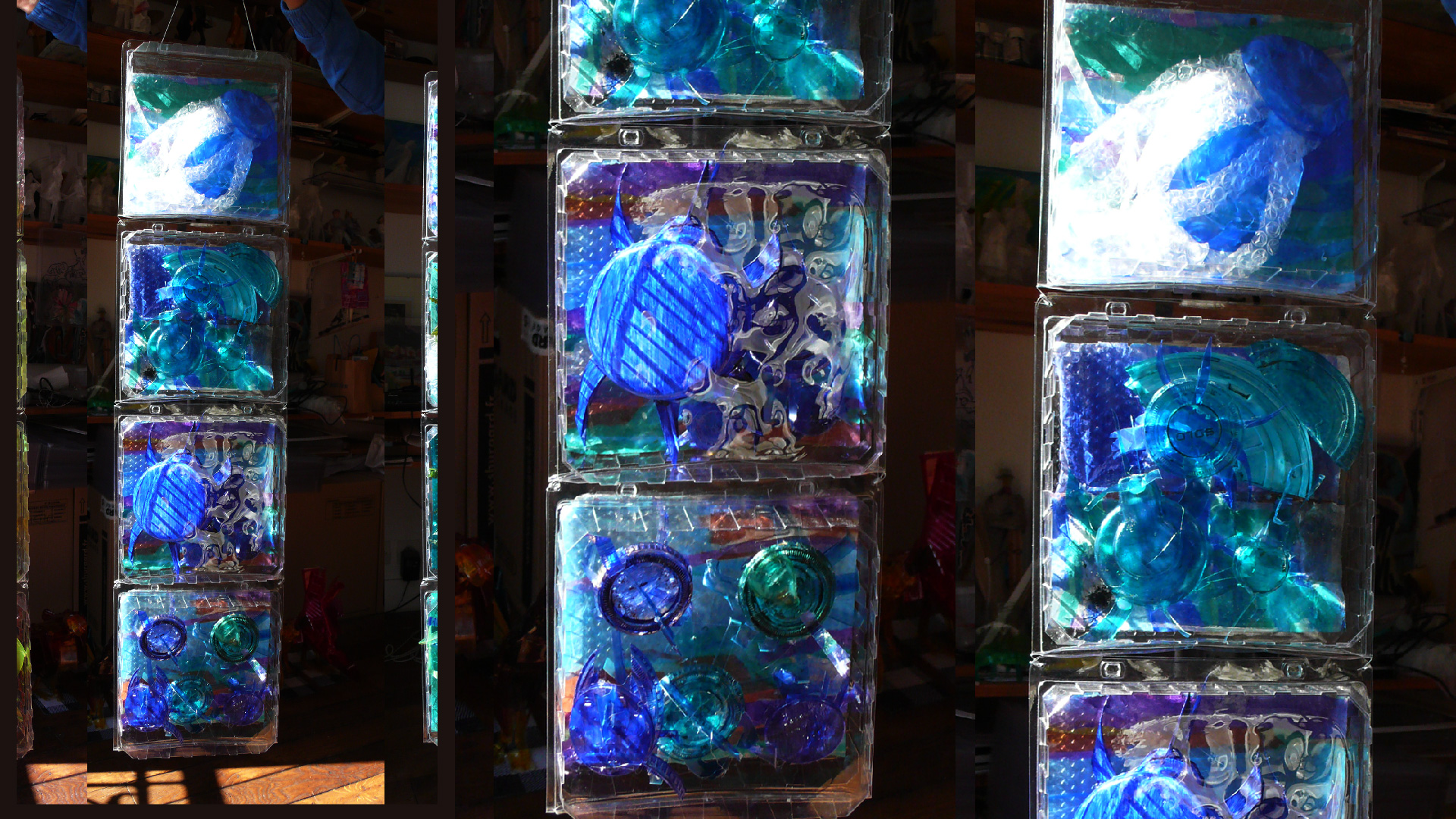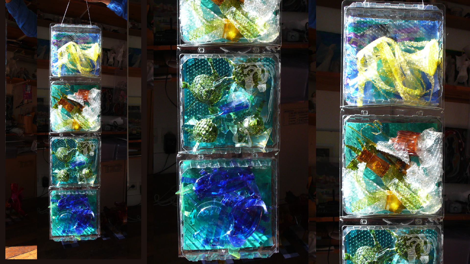 Suspendues comme des reliquaires fragiles, Les boîtes de Charles rassemblent des blisters plastiques transformés en boîtes d’entomologie. À l’intérieur : fragments, éclats, déchets, chutes de plastique recouverts de peinture pour verre. La lumière traverse ces micro-architectures et révèle textures, couleurs et reliefs.