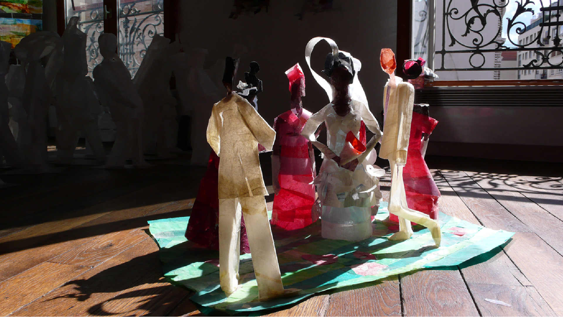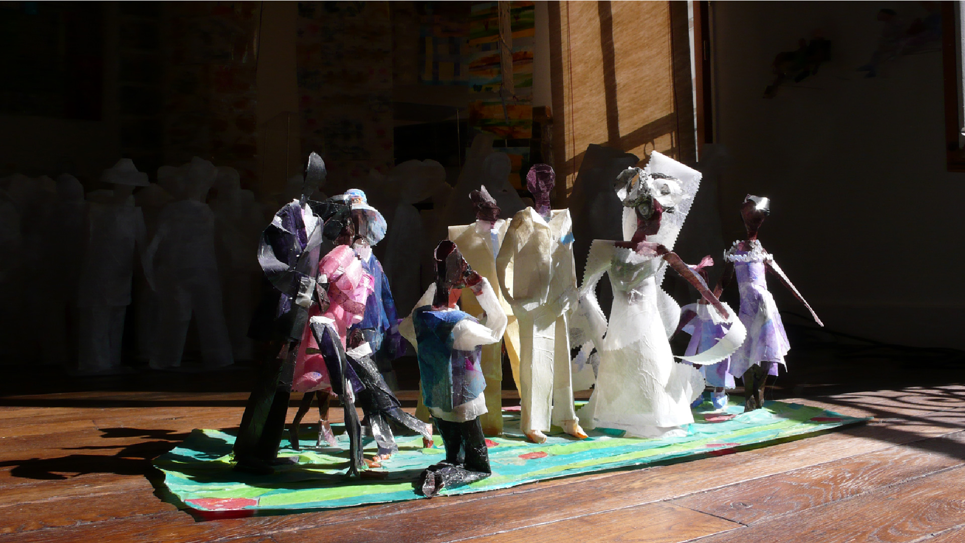 Le choix du blister introduit dans la célébration l’univers du standard et du modèle reproductible. La cérémonie apparaît alors comme une mise en scène sociale où chacun occupe une place assignée, une posture, une silhouette. Les ombres projetées prolongent l’installation, formant une seconde assemblée, fantomatique. L’œuvre ne raconte pas un mariage particulier : entre fête et norme, entre intimité et représentation, elle donne à voir, de façon joyeuse, une communauté réunie dans un moment d’union inscrit dans un dispositif social normatif.