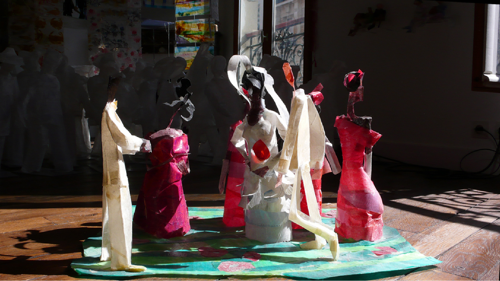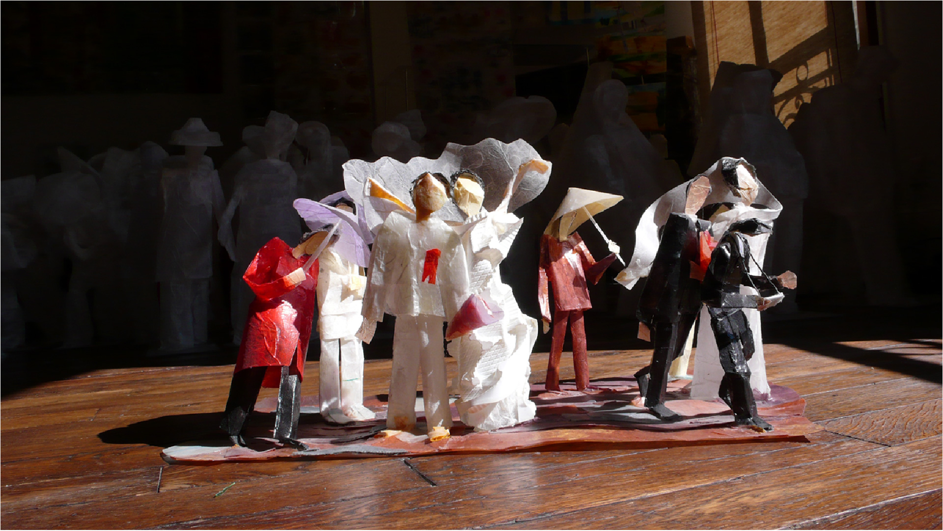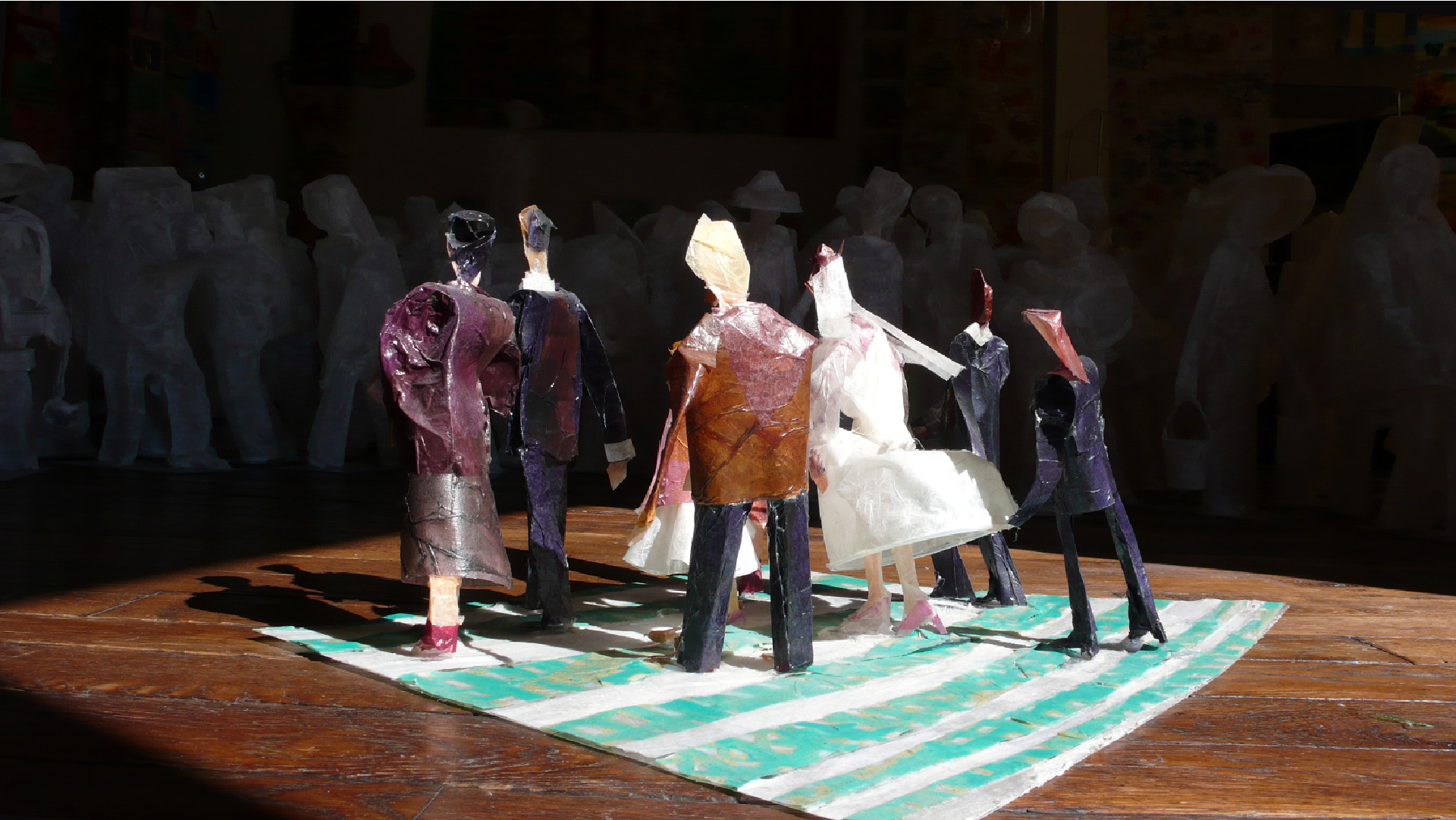 Les Mariages sont des installations composées de silhouettes réalisées à partir de blisters, ces plastiques thermoformés destinés à emballer et à protéger les objets de consommation. Découpés, pliés et assemblés, puis recouverts de papier de soie, ces blisters sont disposés sur des surfaces colorées pour composer une scène sociale codifiée.
