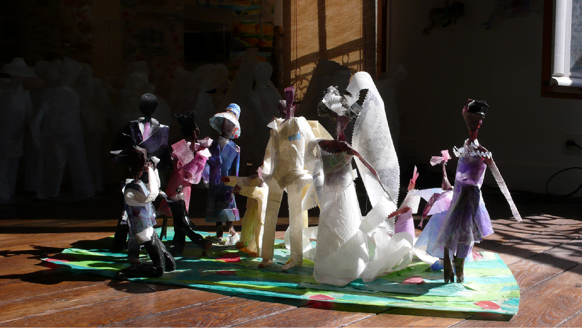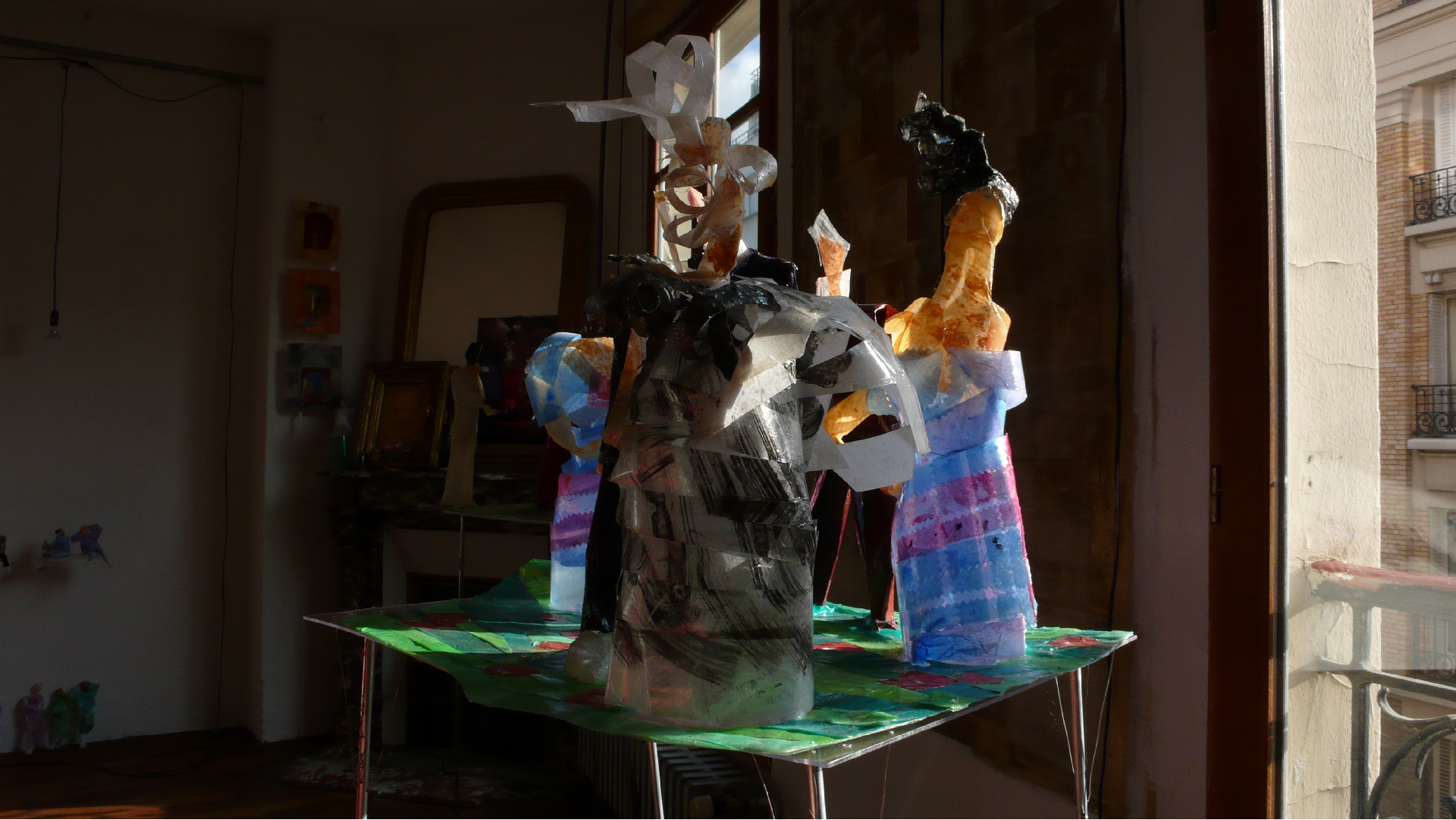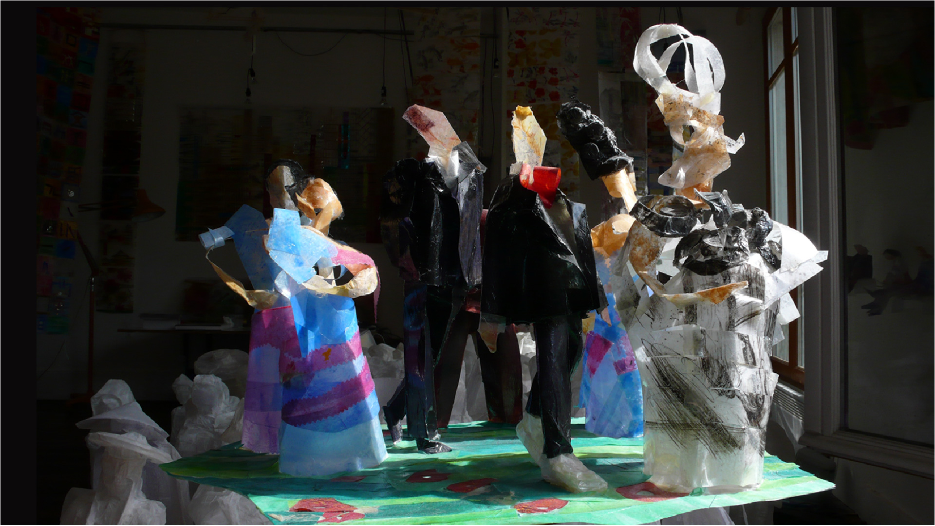 Les Mariages sont des installations composées de silhouettes réalisées à partir de blisters, ces plastiques thermoformés destinés à emballer et à protéger les objets de consommation. Découpés, pliés et assemblés, puis recouverts de papier de soie, ces blisters sont disposés sur des surfaces colorées pour composer une scène sociale codifiée.