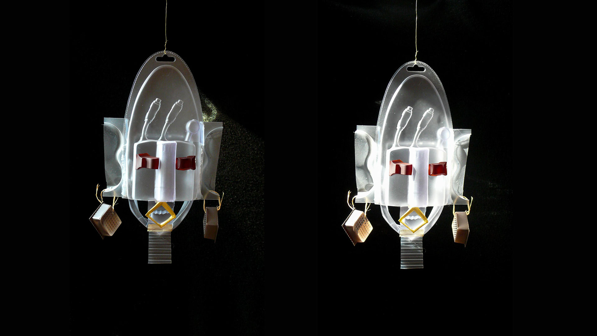 Les masques rejouent joyeusement sur le ton de la farce cette danse transculturelle. Mais le monde qui s’ouvre à nous n’est ni kitch ni empreinte de rêves néocoloniaux. Les emballages perdus de notre monde, recyclés en figures magiques, nous amènent sur un continent étrange où l’exotisme nait des rebuts, l’étrangeté des objets quotidiens et l’altérité de notre méconnaissance de nous-mêmes.